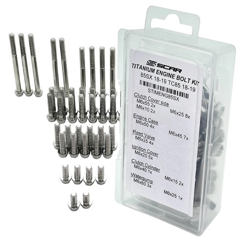 Artikelnummer: TITANIUM ENGINE FASTENER KIT KTM SX 85 / HQV TC 85 / GASGAS MC 85 2018-2026 Overzicht** KTM SX 85 / HUSQVARNA TC 85 / GASGAS MC 85 COMPLETE MOTORBLOK MONTAGE SET **